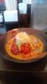 今日は、「冷やしタンタン麺750円」です。右端に氷が浮かんでいて涼しげですね〜手前にはトマト、奥には挽き肉の味噌仕立ての和え物、真ん中に辛みネギ、そして全体にラー油がかけられていかにも美味しそうですね(笑)