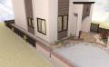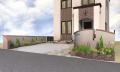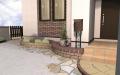 塗り壁や曲線の花壇の奥にアルファウッドフェンスが付きます晴れ