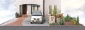 フロントエクステリアは塗り壁とレンガ、ブルースレート(化粧砂利)で 構成されています