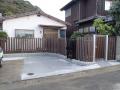 H様邸 リ・ガーデン工事完了しました〜(^^ 駐車スペース3台の確保と見通し及び見栄えを変身させていただきました。 楽に3台駐車可能な車庫土間へと変貌〜(^^ 大きな板塀調の門扉と板塀風のアルミ木調フェンスにて 見えそで見えないデザインを造りました。 ビフォ〜 既存の板塀の延長デザインと高さの確保を念頭にご提案させていただきました。 ご提案パース図面〜 一部デザインを使い勝手優先で変更しました、 スロープや低い階段蹴上にて納めました。 H様ありがとうございました。