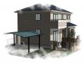 某ハウスメーカ−様ご依頼で設計をさせていただきました。 コンペですので、他社さんがいらっしゃいます・・。 ポイントを書式にしてご提案 どうなるかな?? イメージパースです。 お聞きした内容(ご家族構成・ご趣味等々)でプランをお作りしました。 夜の風景です〜。(^0^) 左右対称の袖門柱塀がポイントです。(^^