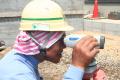 レベルを覗くモリモリちゃん・・・我が社一番の力持ち