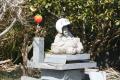 交通安全と書かれたヘルメットをかぶった石の布袋像