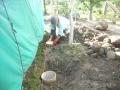 さてさて肝心の裏庭スペースでは、、、 木製フェンスの柱の建て込み作業です まずは土台になる基礎作りです 大昔の洪水の影響で少し掘るとすぐ丸い川石が出てきます なかなか手こずりましたが 一番大事な部分なので妥協はしません