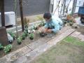 花壇の縁取り、アクセントに白髭石を据えていきます。 自然素材が馴染みを良くします 木々の足元に花々をレイアウト この時間が一番楽しい