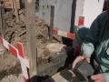 オレンジ色の水糸に合わせて、 黒色のピンコロ石を積んでいます この黒色のピンコロ石は 全面ともいろいろな表情を持っているので、 石の表情を見ながら積みました