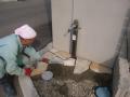 モルタルで張っていきます 水平器でレベルを確認中。 水栓柱周りの為、水勾配を考慮して、 若干ではありますが奥側が高くなるように微調整。 石が入って一気に雰囲気がよくなりました 濡れた石と枕木の相性は、いつ見てもばっちりですね