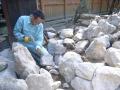 アール状の石積みになるように たくさんの石の中から合う石を選び わずかな出っ張りは石ノミやこやすけを使い石を削り、 敷き間が開かないように石を据えていきます