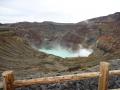 メガネおじさんの投稿です。 朝夕少し冷え込んできていますけど 皆さん体調はいかがですか? 被災地の方々はこれから厳しい冬を 迎えられると思うと心が痛みます。 どうか、頑張って下さい。 さて今回の投稿ですが、 メガネおじさんも奥さんと結婚して 25年を昨日迎えることが出来ました。 よくぞ逃げ出さずにおられた奥さんに 感謝・感謝です。 世間では(銀婚式)というのかな、 それで奥さんに感謝の気持ちを込めて 半日セカンドハネムーンに行ってきました。 場所は阿蘇山 なかなか行かずじまいです。 いつでも行けると思っているのでしようね。 メガネおじさんが阿蘇山火口を見たのは 半世紀近い前のことなので、覚えていません。 火口入口でぜん息、心臓疾患、あといろいろな 病名を聞かれました。かなりきついガスが出て いるのでしょう。ちょっと当てはまる病名もあり 考えていると受け付けの方が「どうぞ」と言われ ほっとしました。ここで引き帰るわけにはいきませんからね! そして火口へ、風向きがフォローの風でこちらにガスが 来なくて助かりました。しかし目の前に広がっている光景は ここは熊本なのか!地獄なのか!それとも宇宙か! 火口の色といい、マダラ模様の地層、湯だまりの悪魔的な水の色、 すべて圧倒されました。それがこれです。