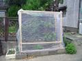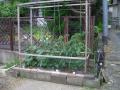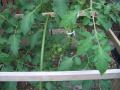 キュウリです。 昨年見たいに、突然果実が消えないように(犯人 カラス) 休日にネットを張れるように枠組みを行いました。 左 2本がキュウリ ・ 右 2本がトマトです 赤く実りだしたら、直ぐにネットを張ります。