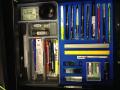 ▼1段目 1段目はよく使用する商売道具的な道具をピックアップして収納。 私は設計なので、シャープペン3種とペン類数種。シャープペン替芯3種と三角スケール2個、消しゴム2個+細部消し1本とシャチハタ。 三角スケールは私たちにとっての商売道具の一つなので2本用意しています。 他は、増えたり減ったりするペンの替芯やクリップ。作図に三定化する必要は無いけれどたまに使うようなペンが入れてある予備スペースを作っています。