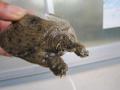 名前は『ポンタ』君 身長7cm がしかし、首を伸ばすと15cmぐらいになります。 現在、グリーンファームHAJIの売り物金魚鉢の中で造り物の金魚さんと一緒に楽しく過ごしております! 何度か脱走したので、近くにあった、バーベキューネットで上を覆って脱走できないようにしております。 彼を保護する際、赤ちゃんだと思って気を抜いていたら、 ガッツリかまれてしましました。 指の先だったんで、しかも全体じゃなく、端っこの一部をガッツリいかれたので 指がそぎ落とされたと思いました。が、指ありました。 チビちゃんでも、噛む力、半端なく強いです。