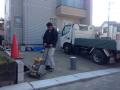担当は林さん。 土間整地後、リサイクル砕石を敷いてキチンとプレートで転圧中。