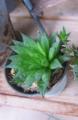 夏の暑さを乗り切って、復活しつつある多肉さん。 名前は・・・分りませぬ。。。(汗) (右側の多肉さんはたぶん、青雲の舞だと思いますが・・・) 夏の盛りにはヘロヘロになって、 溶けてしまうんじゃないかと心配しておりましたが、 今では子株を蓄えながら花芽まで付けて、復活の兆しです。 (良かった良かった・・・) 透明感のある葉がとっても素敵でしょう?うふっ (はいはい、マニアの世界・・・) 右側の多肉さん、葉っぱがモリモリで鉢からはみ出しちゃってます・・・ はみ出してはいけませぬなぁ〜・・・ はみ出しては・・・ ・・・・ (私の腰回りのお肉も上から見たらこんな状態なんかな???) ははっ(汗)。 近いうちに植え替えせねば…です。 私も近いうちに・・・・・・(脂肪の株分け?)せねば・・・ですっ T