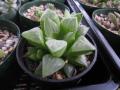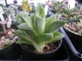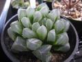 今年の2月に当社多肉の仲間入りをしたハオルチア属の多肉さん、 冬型の多肉なので夏の直射日光が苦手です。 そこで、遮光した状況で管理をせねば・・・と、 夏の間、多肉棚の下の段に場所を変えて、遮光し管理をしておりました。 久々にお姿を見てみると、 【オブツーサ】と【ザラメレツーサ】 オブツーサ ザラメレツーサ 夏に弱る事も無く、元気に育ってくれていました。 相変わらず、美しい窓(透明の水ぶくれに見えるとこ)は、 太陽の陽が当たるとキラキラと宝石のように光って、とっても綺麗です。 ザラメツーサは子株まで蓄えてて、超嬉し〜! だけど、1つだけ微妙〜。。。。。 【宝草】 宝草 たしか、お迎えした時は平たい形で収まっていたのに、 こんなにブニョ〜と伸びちゃって・・・遮光し過ぎたんかな?。。。(汗) 冬型多肉もまだまだ分らない事ばかりで奥深しです T