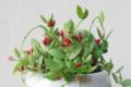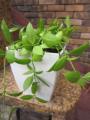 面白い植物を見つけました。 その名も【カンガルーポケット】正式名はディスキディア・ぺクテノイデス 別名、フクロカズラ、ミリオンハートなどとも呼ばれているようです。 原産地は東南アジア〜オーストラリア、 太平洋諸島に約80種類が分布するつる性の多年草で、 茎の節から根を出して岩や樹木に張り付いて成長する着生植物だそうで、 一部の葉が肥大して、内部が空洞になった貯水嚢(ちょすいのう)を持っているのが特徴です。 一つだけプクっと大きくなってるのが貯水嚢です。 この形から連想してカンガルーポケットの愛称がつけられたとか・・・ 貯水嚢 の内部には根が生えており、 そこから水分や養分を吸収することができるそうです。(へぇ〜) (備えあれば憂いなし・・・出来た植物ですなぁ〜) 5〜6月には小さな赤いお花も咲かせるそうですが 見た目には小さな蕾のようです。 何とも不思議な珍植物ですよね。 でも、暖かい場所に分布する植物だけに寒さには弱いらしく、 日当たりの良く、風の通る場所がお好みで、 土中の多湿は嫌うが、葉面やツル部分は多湿を好むとか・・・ ・・・っ〜事は、 ・・・・・・・・ 今更だけど、我が家の何処に置けば良いんだ。。。はははっ(汗) そして、冬越し出来るのか? どうやら、又、やってしまった・・・ 後先考えないで買っちゃうパターン。。。(学習能力無いな〜 ははっ) 取り合えずは西日しか当たらないリビングの窓辺で様子見です(汗) 無事に冬越し出来るといいな〜(汗) T