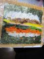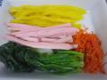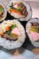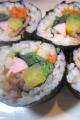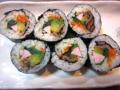 先日の節分の日に、「キンパ」又は「キンパプ」と呼ばれている韓国海苔巻きを作ってみました。 キンパとは・・・・( Wikipedia調べ) 日本から伝来した海苔巻きに由来し、19世紀末から食べ始められたとする説が一般的である。 海苔巻きとの違い 巻き簾を使用する調理法などは、日本の海苔巻きと同じであるが、 キムパには酢飯が使用されず、ごま油が加えられていることが一般的であり、 また中に入る具材が日本の海苔巻きに比べて多く、生魚も使用されない等の違いがある。 製法 あぶった板海苔の上に米飯を均一に薄く敷き、その上に細長い形に整えられた具材を載せる。 米飯は、塩やごま油で味を整えるのが一般的である。 具材は、複数の材料を用いることがほとんどである。 一般的に使用される具材には、ニンジン、ホウレンソウ、キムチ、エゴマの葉、たくあん、牛肉、 ハム、ツナ、カニかまぼこ、チーズ、卵焼きなどがある。 我が家では、人参・ほうれん草・たくあん・ソーセージ・牛肉を巻きました。 作り方 1 温かいご飯をボウルに入れ、塩、ゴマ油、白ゴマを入れて混ぜ、常温まで冷ます。 2 ほうれん草はゆでて水気を切り、塩、ゴマ油で和える。 3 人参は千切りにして油少々をひいたフライパンで炒め、塩、砂糖で下味をつける。 4 牛肉をフライパンで炒め、焼肉のタレで味付け。 5 他の材料(たくあん、ソーセージ)を1p角ぐらいの大きさに切って揃える 6 海苔の上に少なめのご飯を広げる。 7 6の上に人参・牛肉・ほうれん草・たくあん・ソーセージを置き、硬めにしっかりと巻く。 8 1p〜1.5pぐらいの厚さに切って盛り付ける。 *ただ、太巻きのように1本丸ごといただく場合は、 ほうれん草など噛み切りにくいものは、細かく切ってから巻くようにします。 このキンパはご飯が少なめなので、出来あがりサイズは中巻きサイズ。 それを薄めに切っていただくので、小さなお子様やおちょぼ口の私にもピッタリ〜U+203C (。-ω-)ゥィゥィ♪ そして、しっかりめに味付けがされているので、お醤油などに付ける必要もなく、 つまんでパクパク・・・とおつまみ感覚で食べられるのも良いですよ・:*:・゚☆d(≧∀≦)b゚+.゚イイ 又、ゴマ油の香りが後を引いて、又、ついついつまんでしまうのよね〜。。。 中に巻く具材を赤、白、黒、黄、緑の5色になる様に組み合わせ、 5色の食材をバランス良く食べると健康にも良いと考えられているんだそうです。 確かに、色も鮮やかで見た目にも食欲をそそりますよね゚.+:。(・ω・)b゚.+:。グッ 家族にも大好評で、又、次回は具材を変えてチャレンジしてみようと思います。 皆様も是非、お試しあれ〜U+203C(* ̄▽ ̄*) T