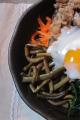 5:ご飯が炊けたら、牛肉・ほうれん草・もやし・人参・ゼンマイをのせ、最後に温泉卵をのせたら