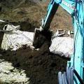 さて、順番は逆?になってしまいましたが、こちらの写真は弊社の置場、黒土を「シートモッコ」に積み込むシーンになります。専ら、最近では「ペイローダー」というホイル付きブルドーザー?みたいなものがありますので、一度に大量の黒土を持ち上げることが可能になりましたが、一年前はまだ、その様なものがありません。で、小型のパワーショベルで少しずつシートの上に積み上げるかたちで載せます。