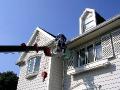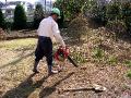 雨樋の掃除、もし、この重機がなかったらどうでしょうか?多分、屋根の上に乗り込んで、安全帯やロープなどを使用し、殆んど曲芸状態での作業になったと思います。実は、今、カゴに乗って作業をしているうちの従業員は、前職が板金屋さん、こういう仕事も随分と得意だそうですが、これだけ傾斜のついた屋根だと、正直、お断りしたことも前にあるとか・・そうですよね、今年の大雪で、新潟などでは、随分とお亡くなりになった方もいらっしゃいます。早く、安く、丁寧に・・は、仕事の基本でもありますが、最近は、崩れてきているのも事実になります。お金が先行することが多々・・やはり、安全第一です、何事もそうですが、皆さんも初心に帰りましょう、勿論、私も含めてです。怪我をしてからでは、遅いのですからね。2枚目は、エンジンブロアを使用しての清掃シーン、一々、掃いていられない場合も数多い・・持つべきものは、優秀な(使える)道具です。 |