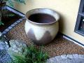 さて、シリーズ最終回になります。玄関前の水鉢設置工事が完了致しました。水鉢下には、大きさが三分といわれる錆砂利を敷き込み、水鉢設置の安定性?をより向上させました。そう、このくらい細かいものであれば、水鉢自体を水平に設置するのは難しくはありません。また、建物の感じとよく似た色遣い、マッチした雰囲気になりましたね。また、水鉢のデザインともよく合います。そうですね、よく玄関脇にこの様なものを置くと傘立て?に成りがちですが、まあ、ここまで作業すればそれは無さそうな気が致します。「もう少し暖かくなれば、この鉢の中に睡蓮を入れてみるつもりだ」と作業終了後に、ご主人と談笑をさせて頂きました。