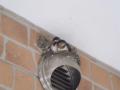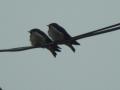 日曜の朝、巣立ったツバメ。2羽は巣の中、2羽はもう電線にとまっていました。
