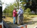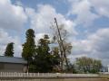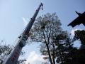 最後の最後で雨にやられました。 合羽を持っていなかったのでずぶ濡れです。 雨の日の土いじりはきれいにしてるはずが 逆に汚くなるので駄目ですね。 だいぶすっきりしてきたお庭解体。 こちらのお庭は人力で低木類を撤去。 もう少しかかりますかねぇ それから昨日かけなかった神社の樹木伐採。 お祓いも済ませいよいよ枝打ち作業です。 まずは安全を確認しながらカゴに乗ります。 しかしこのカゴ結構さびてるな・・・ 行ってらっしゃい 枝先は下に落とさずお持ち帰り。 お帰りなさい 太い枝はワイヤーで吊って降ろします。 その時ばかりはカゴから木に飛び乗り 伐採します。(これが怖い) しかし私は下から指示する役です。 怖くはありませんがずっと上を見ていて 首が痛くなりました 職人さんに頼み撮ってもらったカゴからの画像。 上からの景色はこんな感じみたいです 遠くからの枝打ち状況はこんな感じです。 20mは余裕である大きな木ですね。 このほかカシやスギなんかもありますね。 昨日は結構風が強かったので 見ている私もドキドキでした。 結構この他にも木がありますな