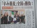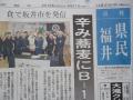 午後からは雨が降り続き 合羽を着ての作業となりました。 私の現場は公園の草刈。 大したものではございませんので画像なし。 しかしこちらの出来事は大したものです。 とうとう坂井市の「越前坂井辛み蕎麦」が ご当地グルメ愛Bリーグ(B級ご当地グルメ)の 正会員に認定されましたよ 北陸では初らしいです。 各新聞の一面で掲載されテレビでも少しの時間ですが 特集を放送してくれるみたい。 こちらの新聞でも大きく扱われていました。 よ〜く探すとしんなり私も写ってますよ そして昨晩はマスコミを通してのプレス発表会。 市長さんを始め「あなたの蕎麦で辛み隊」の 隊長さんや副隊長さんらがご出席し認定書を開封 私たち隊員も参加してきましたよ。 あっここにもいました自販機王さん。 んっ隣は自動車王だな。 これからはB-1グランプリや地元の催し物の 出展なんかで忙しくなるんだろうな・・・。 それで地元坂井市や福井県をも巻き込んで 元気になってくれるならやりがいがありますね。 そしてその前にしばし飲みながらご歓談。 昨日は意外に早く帰れたな