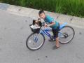 少し日も落ち暑さも和らぎ事務所の下では 息子さんが自転車に乗って遊んでいます。 おぉ〜かごに何やら乗ってますね。 実家のワンちゃんだ 落っこちないようにね。 しかし暑い一日でした。 たまにボーっとしてしまうぐらいの暑さですから 剪定作業も木の上から落っこちないように 安全第一ですね。 御簾垣の応援現場も終わりお盆までの 後数日は職人さんも社員さんも全員剪定作業です。 お盆過ぎになってしまったお客様・・・ごめんなさいね