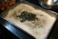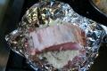 アルミホイールによく混ぜた岩塩を敷き、肉を置き全体を塩で包み