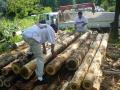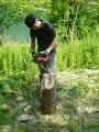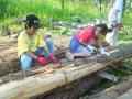 我が展示場「庭屋」のログハウス〜 このタイトルの仲間達の手で作り上げたものです そして、本日次のログハウス作りが始動です 今度はここに設置する予定 まずは間伐材運び 傍らでは好き放題の子ら けっこう大変・・皮むき 子らも必死 材に余裕があったのでチェンソーカービング さすが フクロウ もう一人もカービング なかなかリアルな わに? 本人曰く「どらごん」だそうです フクロウは「庭屋」に どらごん(わに?)はそのまま放置されてました 今日も全開終了v