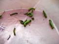 こんばんは 今日も暑かったですね〜 こんなに暑くて、汗をかいても、体重キープのらくだです 今朝事務所にいると、展示場のらくだ嫁から 「▽×ぎゃ、〇▲うわ〜10匹〜すぐ来て〜」と電話が たぶんまた昨日の毛虫だろーと思って行ってみると・・・ やっぱりなー そんなことで、呼ぶなよ〜と文句を言いつつ コクチナシを見ると! 明らかに、昨日より剪定が進んでる・・・・ さらによ〜く見ると あらあら、いるわいるわ こんな小さなコクチナシに なんと18匹! ↓クリックしちゃだめ! あ〜だめだって言ったのに〜 クリックしちゃいましたあ?・・・くっくく この子のエサにはちょっと大きすぎて駄目でした