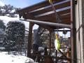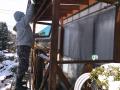 以前作った、パーゴラ付きデッキです。 年数も経ち、そろそろ塗装も痛んできたので、塗り換えとメンテナンスのお話が出てきました。 現状の色では、オスモカラーのシーダー色なのですが、今回はグリーンにしたいとの事。 大分イメージチェンジとなります。 写真は、まず洗剤を使用しての洗浄です。 汚れを落としてから、乾かしてペーパー掛けとなります。 洗浄は、天気が悪くても出来ますので、作業をいたします。 ちょうどこの日は、前日と打って変わって雪が降り、すっかり冬模様になってしまいました。