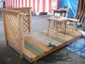 取引先の問屋さんの展示会で、出展したウッドデッキです。 デッキの組み立て実演コーナーを承りました。 フェンスは、無塗装ですので、カナダ杉の素材の色です。 床板は、数種類のオスモカラーの色を使用しました。 オスモカラーは、色の種類が充実していますので、使い分けますと、 個性豊かなデッキが出来上がります。