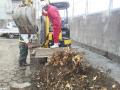 重機を使い、周囲の土やアスファルトを掘削、幹ほどの根っこを切りつつ徐々〜に根っこをおこしていきます。