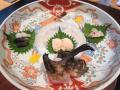 前菜は菜中海老塩ゆがき いぎす木の芽味噌掛け 地魚みりん干し