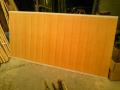 今日は椹のへぎ板を鎧貼りしていました これは主に茶室の掛け込み天井などに使用されるものです 鎧貼りとは重ねシロを作りながら横に1まいづつ貼っていくもので見ためが鎧のようになっているのでこの名になったんだと思います 使用している椹や黒部の木は木曽地方の名産品ですが最近は木が売れないので山から木を出すためのヘリコプター費が捻出できないと山の人達は嘆いています 木は竹と違って簡単にはかつげませんから・・・竹で良かったです