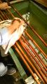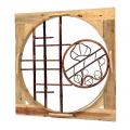 この竹は金明煤竹と言って非常に珍しい煤竹です 煤竹とは古民家の天井で100年以上、囲炉裏の煙で燻された竹です。 よくある煤竹は真竹や破竹が多いのですが、これは金明竹が燻されたものです 金明竹とは国の天然記念物にも指定されていて竹の色が金色のようになっています この竹、少し癖があり真っ直ぐに加工するのが非常に難しい竹です 火で焙って真っ直ぐにしようとするとゴムのようにグニャグニャ曲がり非常に手ごわいです 逆にその特性を活かして細工などをするのには非常に便利な竹でもあります 例えばこのような窓もそうです。 竹も人間も適材適所ですね>